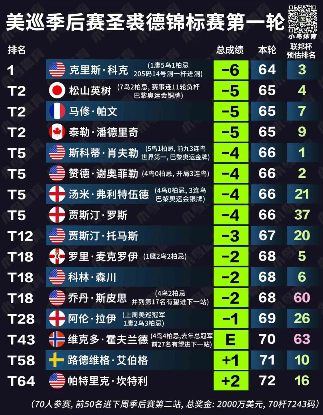 好在季后赛,并非所有美巡赛会员都有资格参加。另一位日本球员久常凉 (Ryo Hisatsune) 由于联邦杯排名第83位,无缘圣裘德精英赛的70人阵容——他的球童田渊大贺因此得以被松山英树“借用”,成为了日本一哥季后赛的临时球童。