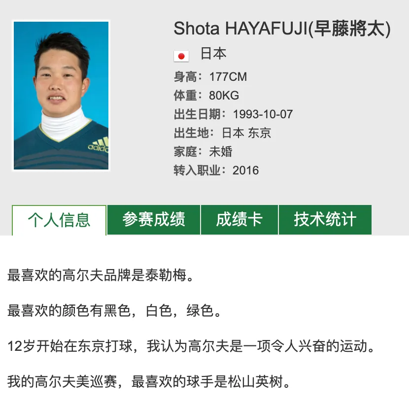 中巡赛官网上的早藤将太介绍