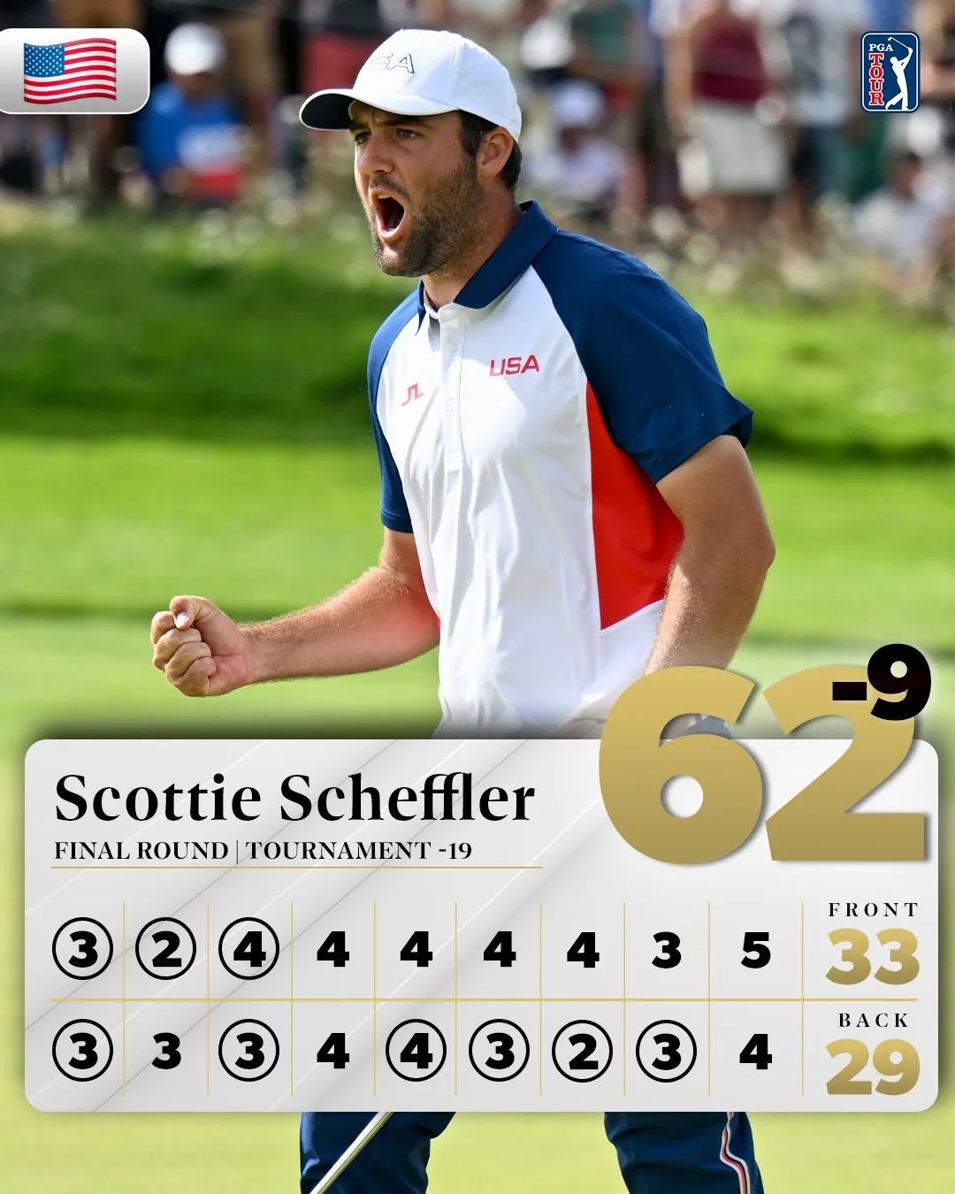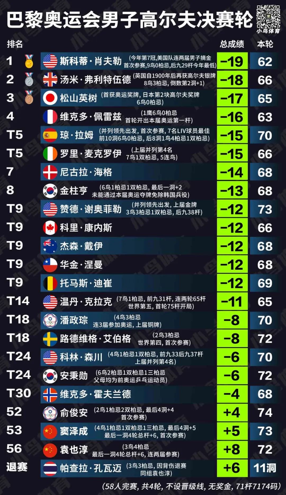 2024年无论赢得美国大师赛、卫冕球员锦标赛、哪怕6胜中的任何一役,肖夫勒也从未飚出过半场29杆。但这一壮举,偏偏就在四年一次的奥运会决赛轮后九洞上演了!”我从领先榜看到了拉姆打到-20,所以我决定全力一搏调,努力抓下更多的小鸟,我也不知道自己能冲到哪里,或许能够拼出一块奖牌,毕竟领先的是拉姆。”赛后他复盘道。