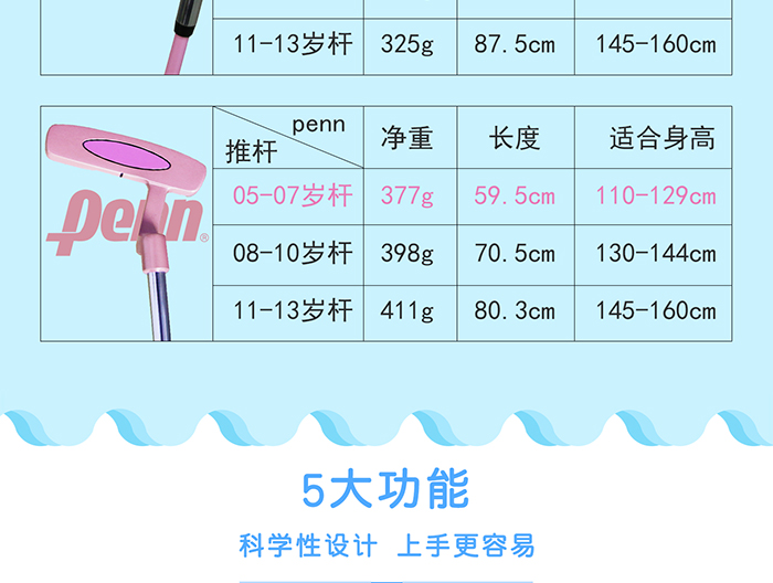 Penn球杆儿童套杆5支杆含球包 Penn5至7岁女孩下场比赛球杆正品特惠