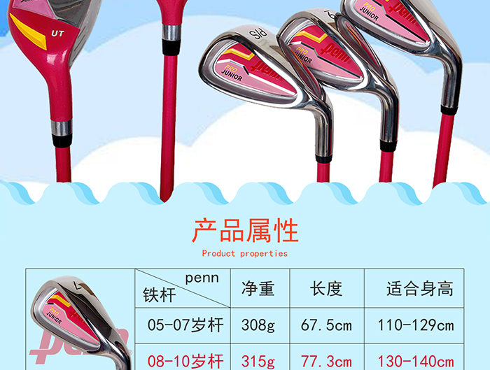 Penn球杆儿童高尔夫套杆6支杆含球包Penn8至10岁女孩下场比赛球杆正品特惠