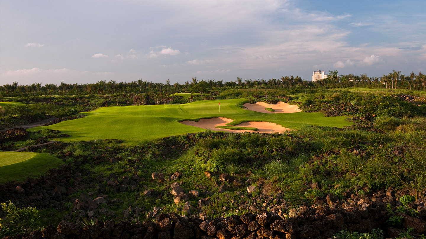 这18个3杆洞组成的球场集合了独特而清晰的风格特点,每个果岭设有两个洞杯。这样的果岭设计是为了提供两种选择:一个更简单、位置更容易估计,另一个则要困难得多。植物园式的园林风格给人一种很享受的布满各色树木和鲜花的氛围环境,与海口的蓝天和清新空气相得益彰。所有水平级别的球手都可以在这座球场找到适合他们的心情和技术的乐趣。家庭成员、初学者以及职业球手,都能够在此打球或练习,度过愉快美好的一天。