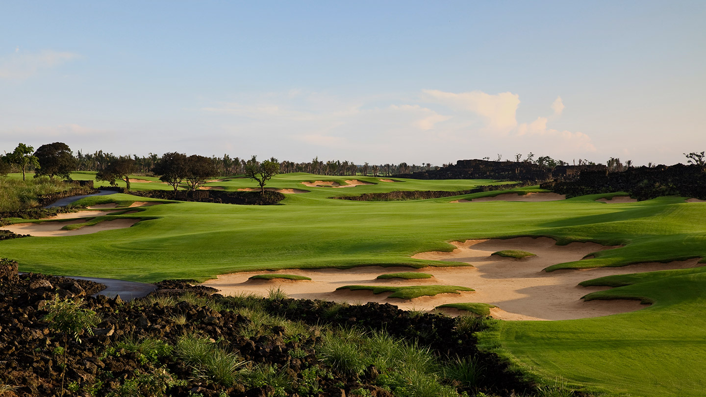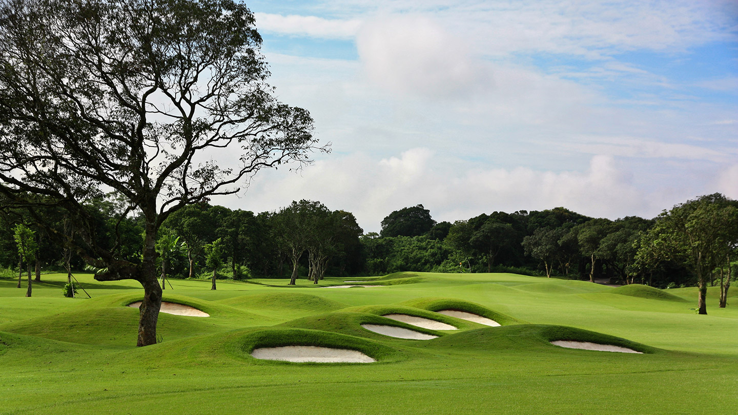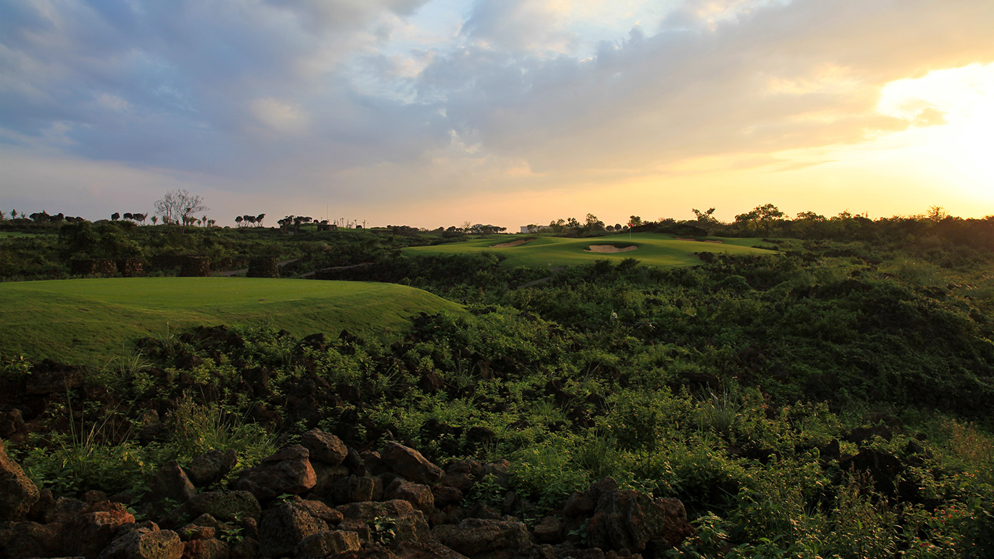 整座球场中的皇冠珠宝——锦标赛球场。这块不含房产区的纯高尔夫球场占地350英亩,穿梭于由高大树群、茂密丛林以及大片的湖泊湿地等组成的壮阔景观当中。球场特有的地貌特征,是整个场地的火山岩地表,以及从25英里之外运来的覆盖在岩石层上的地表土。现场的原始地形落差很大,设计师非常注意在原始地形中”寻找”球洞,以尽可能地减少石方量,同时多保留一些现场美丽的荔枝树。球道造型与周边景观相辅相成,强调地表排水,使得集水井式排水系统的压力大大减轻。原始的火山岩基底以及火山石墙、村庄的遗迹被穿插保留在球场当中,形成一种强烈的视觉对比,同时也记录着这里的过去。
