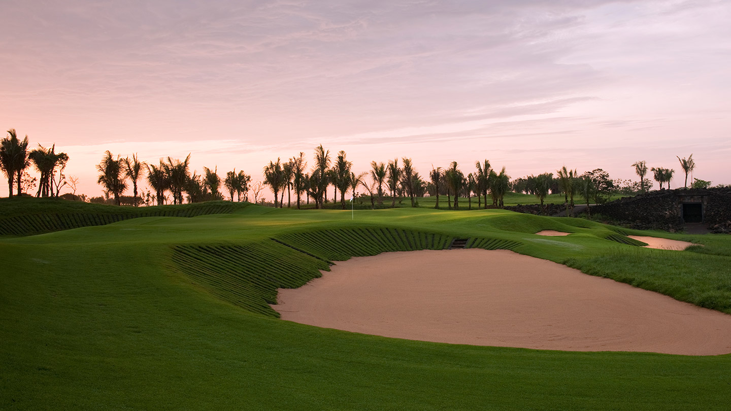 短三杆球场,击球一杆上果岭,然后就是果岭推杆,球道周围都是被火山岩和大片沙坑包围。这个球场和周围自然景观融合的天衣无缝。
