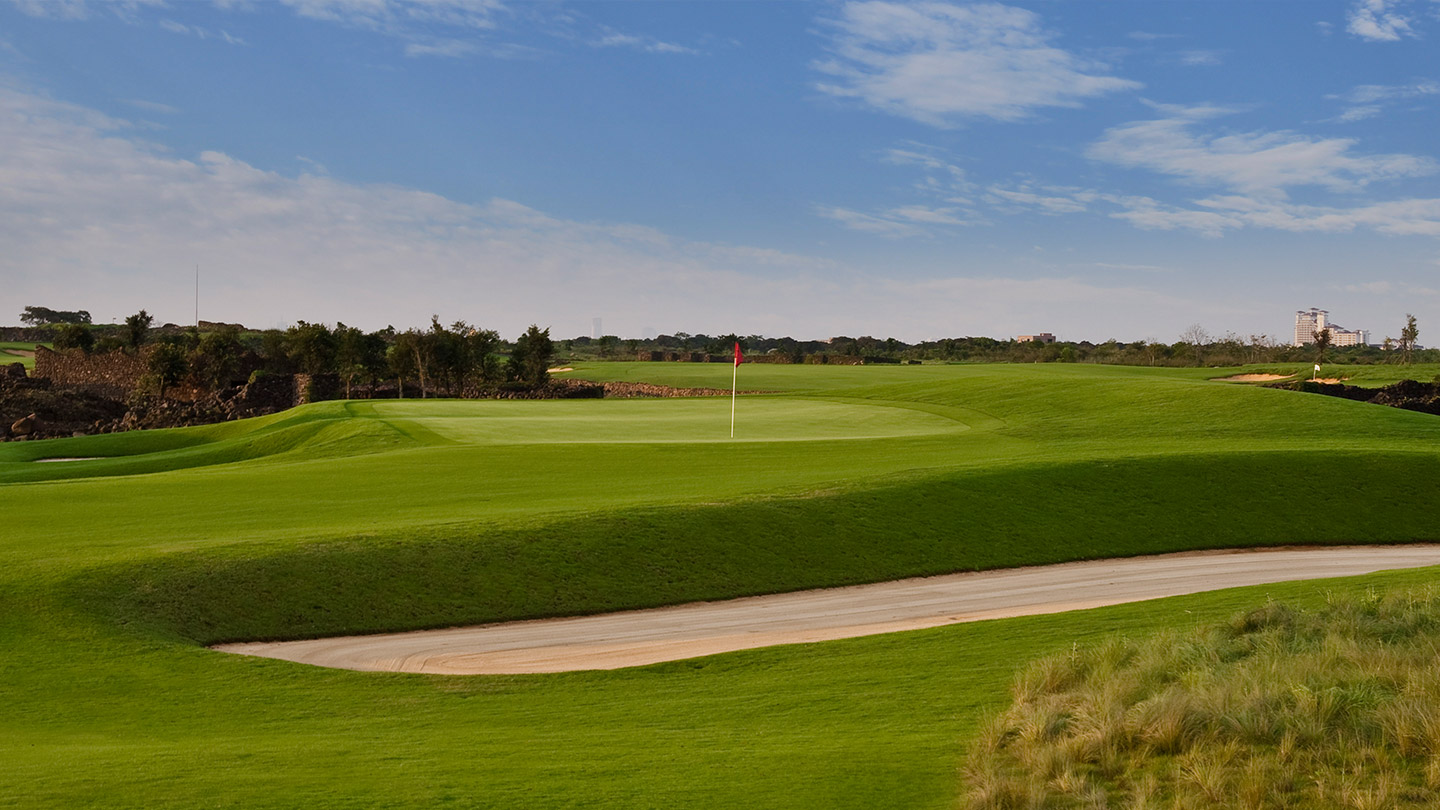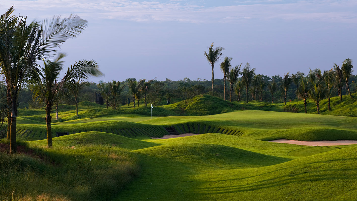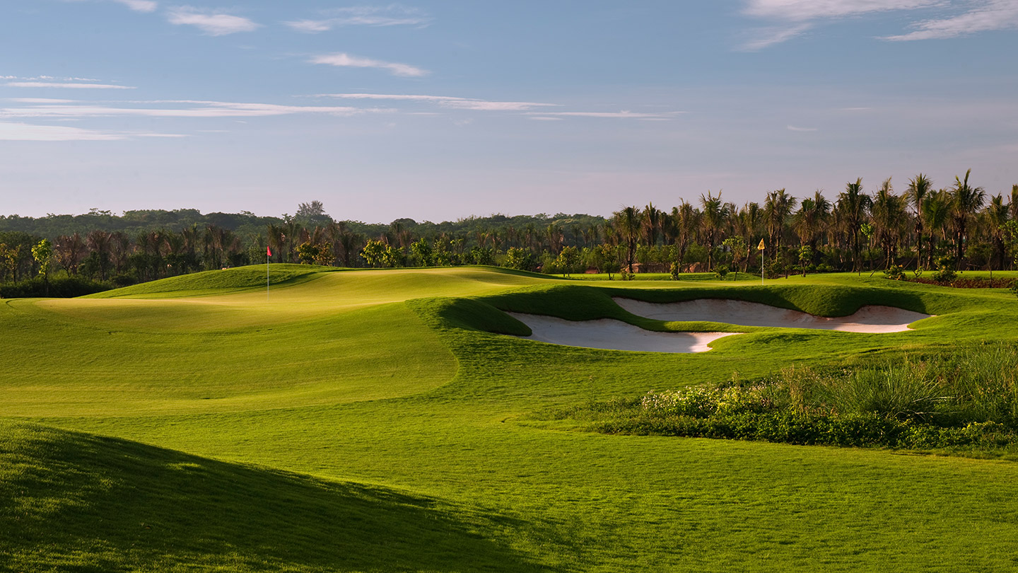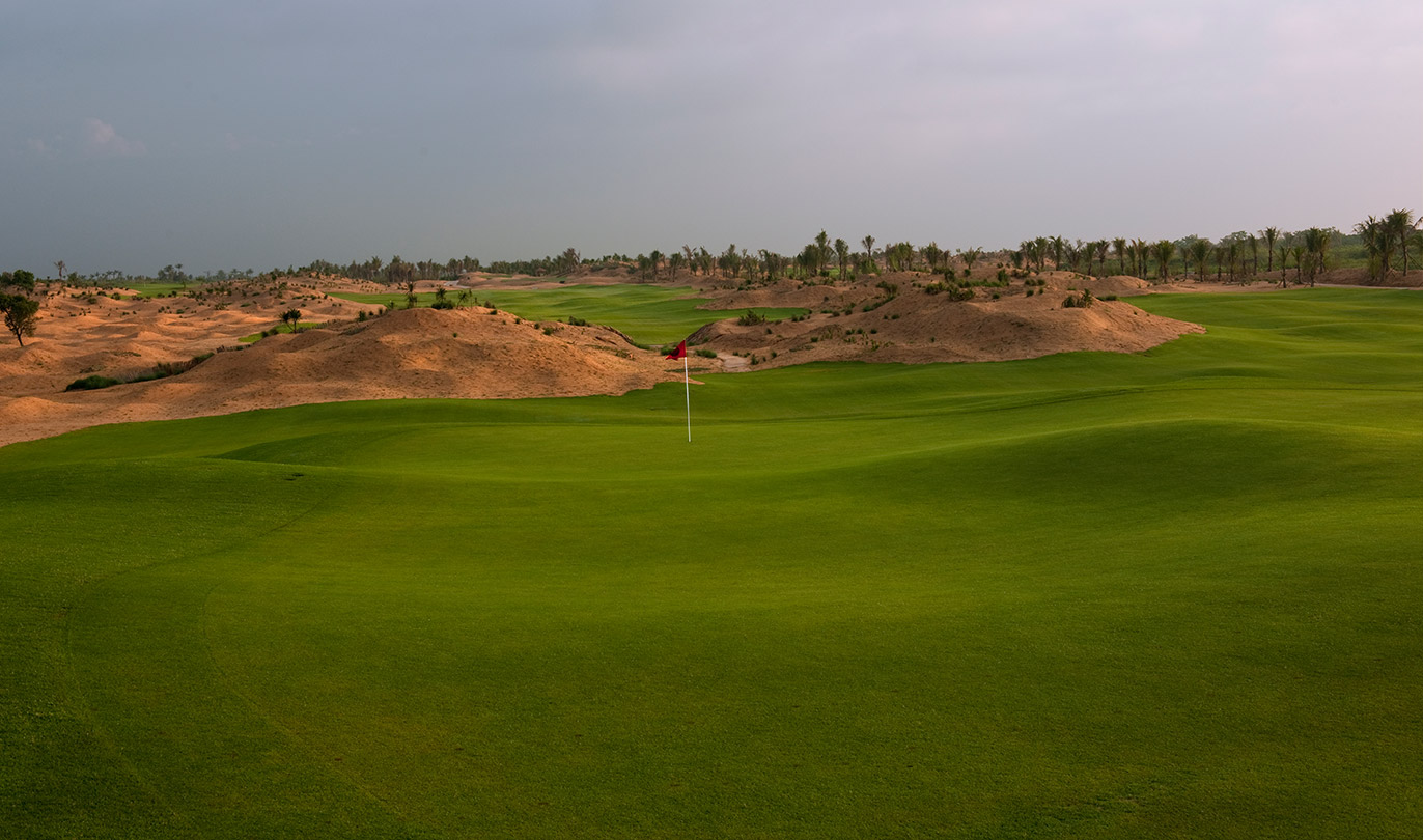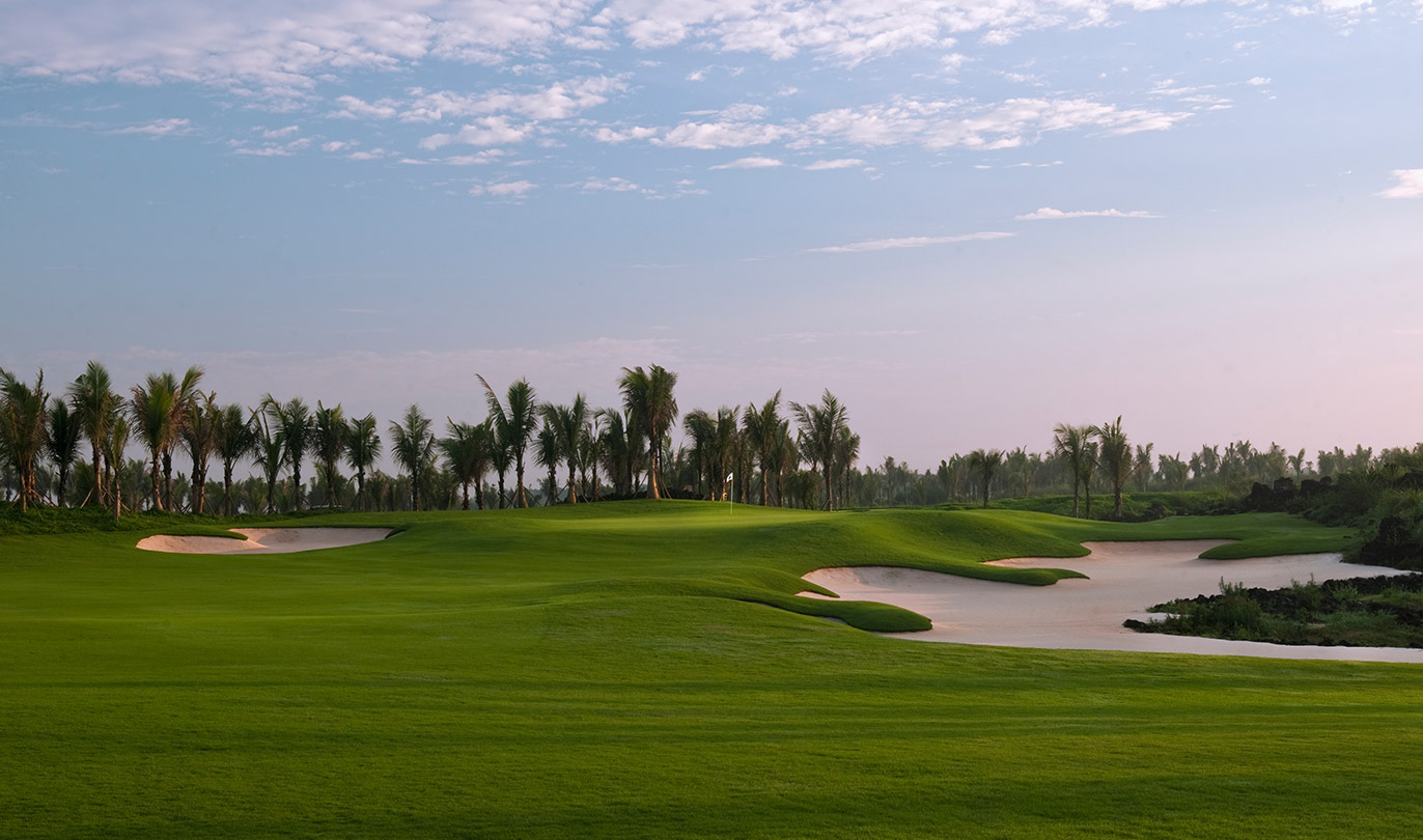将人们带入”沙的世界”,这块球场以高大的沙丘和海南岛广阔的海滩上所能找到的当地植被为景观,呈现出富有特色的环境条件。不过,它并不是一块沙滩球场,而是以波浪起伏的造型和度假区中最大的果岭为特色。这些狂野的果岭造型,可能会造成一些令人恐怖的长距离推杆,但是,它又并不是一座能够简单以距离征服的球场。球手在果岭上短距离推杆的精确性同样重要。作为一个大约仅有6600码、标准杆为70的球场,这里发球台和果岭间的密切连接非常有利于人们在其中的行走,也大大降低了打球所需的时间。