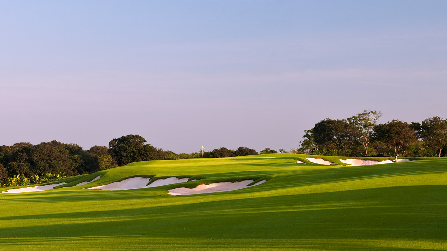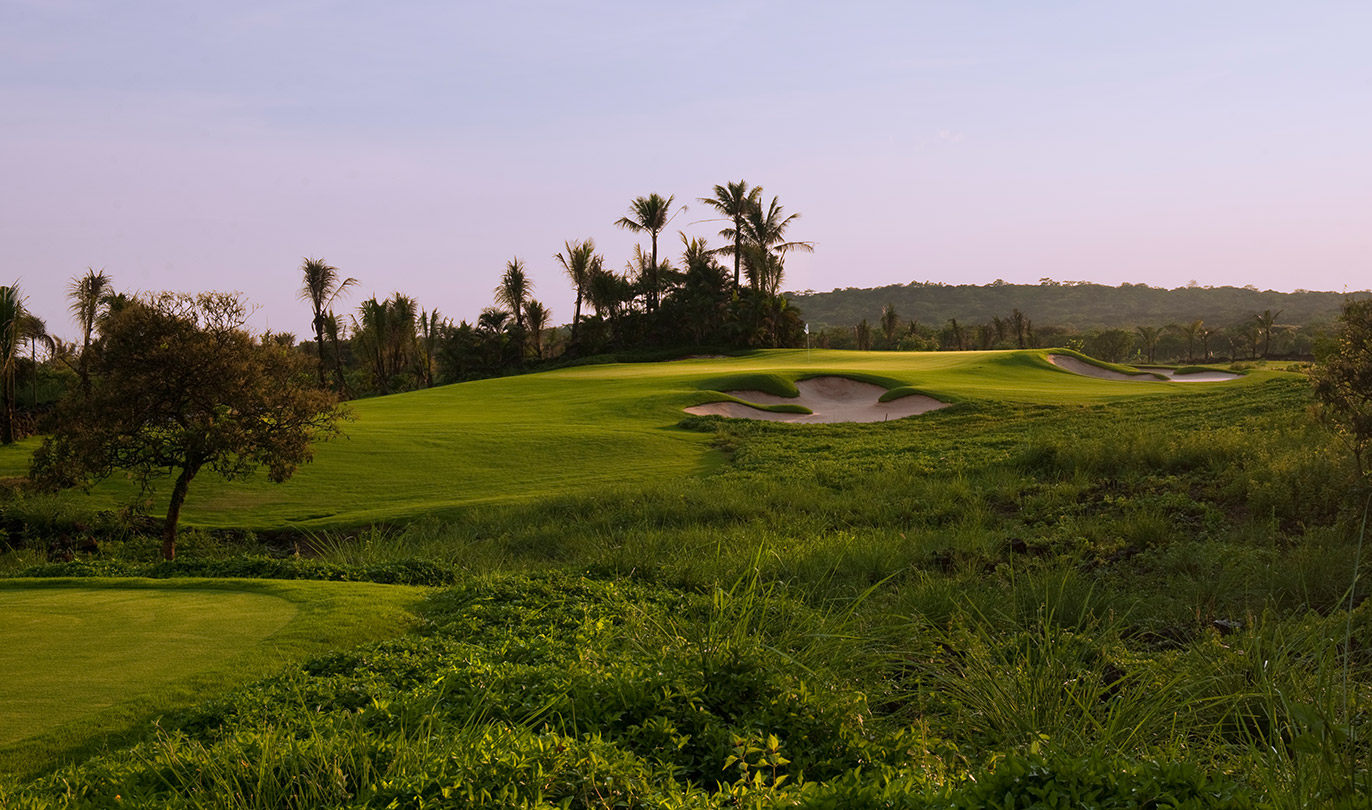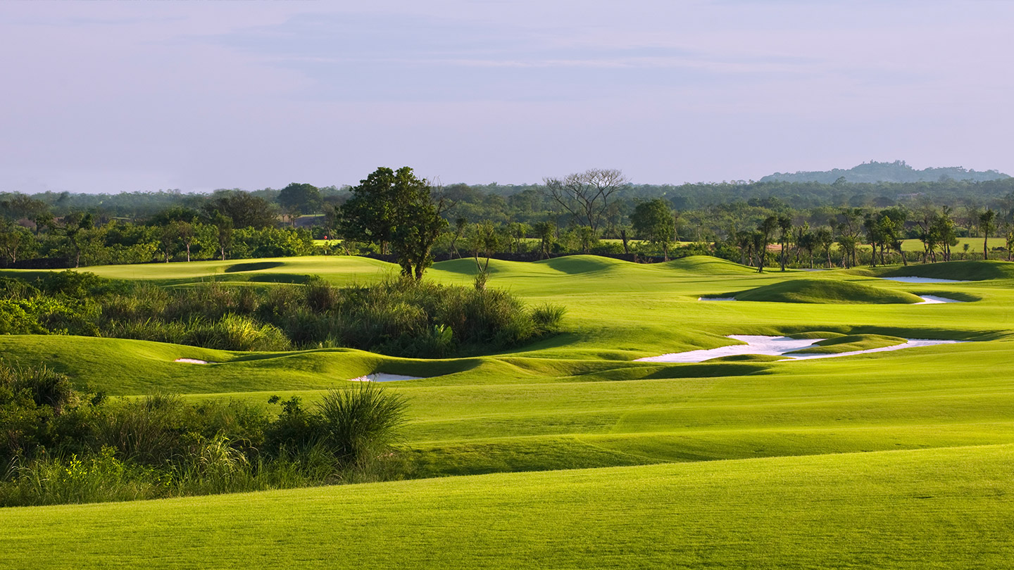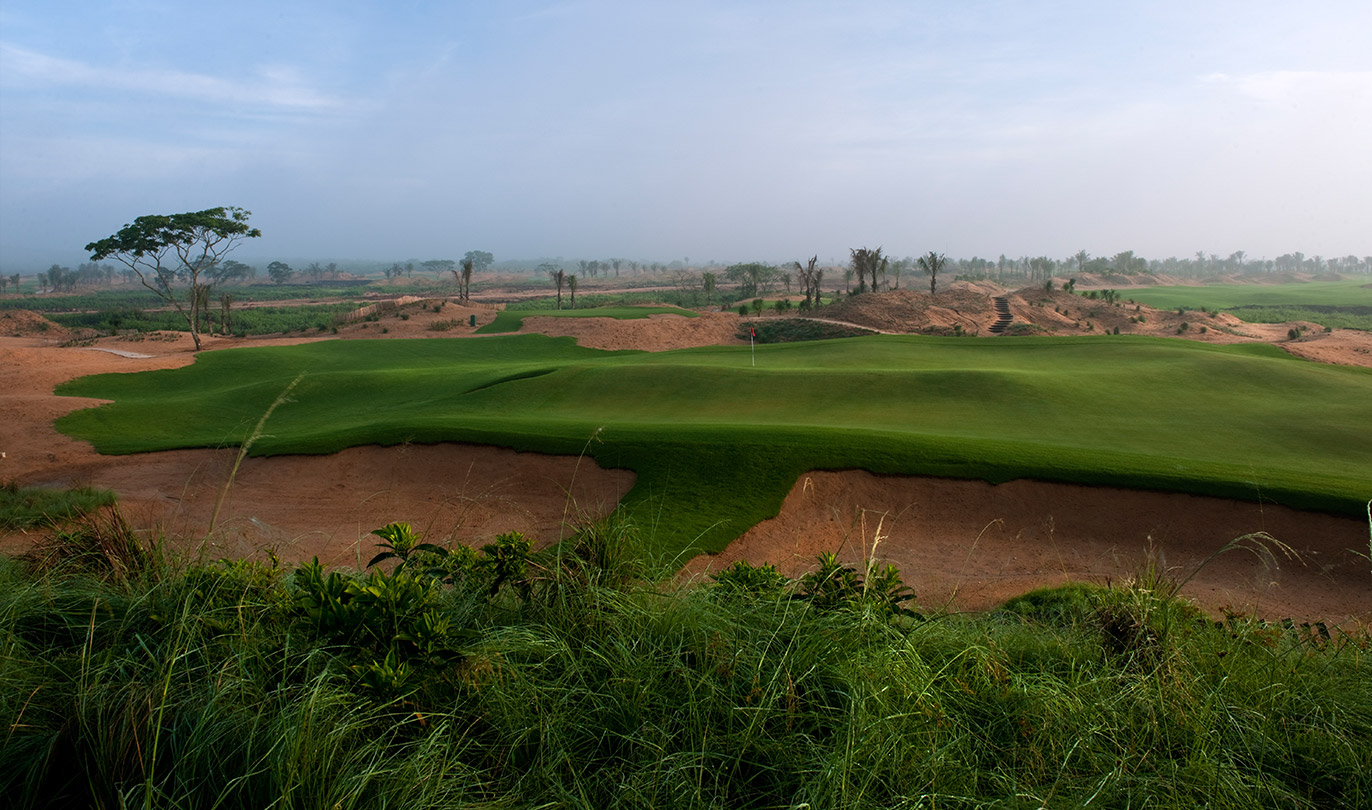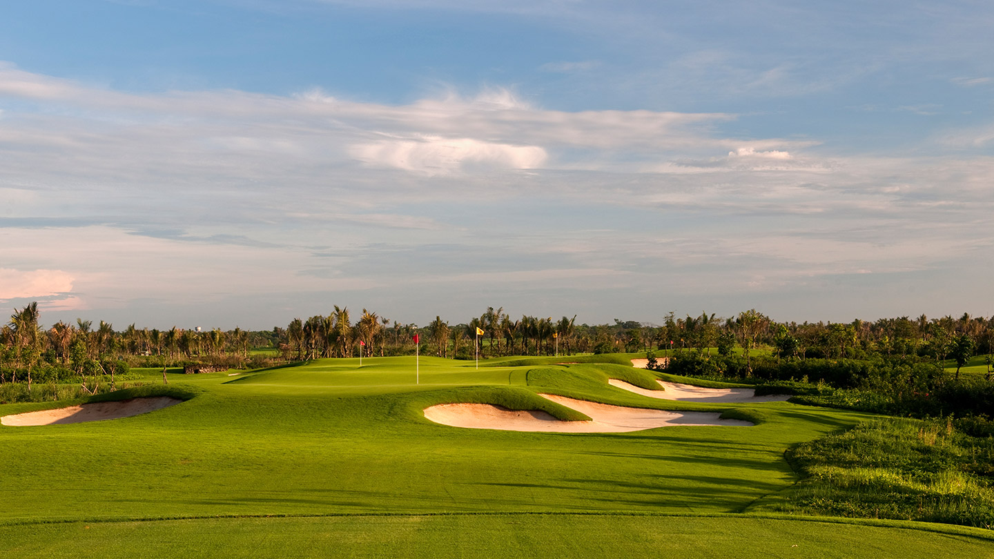 将人们带入”沙的世界”,这块球场以高大的沙丘和海南岛广阔的海滩上所能找到的当地植被为景观,呈现出富有特色的环境条件。不过,它并不是一块沙滩球场,而是以波浪起伏的造型和度假区中最大的果岭为特色。这些狂野的果岭造型,可能会造成一些令人恐怖的长距离推杆,但是,它又并不是一座能够简单以距离征服的球场。球手在果岭上短距离推杆的精确性同样重要。作为一个大约仅有6600码、标准杆为70的球场,这里发球台和果岭间的密切连接非常有利于人们在其中的行走,也大大降低了打球所需的时间。