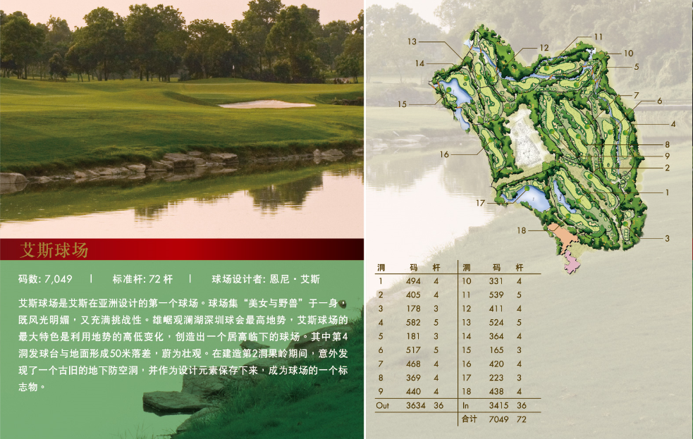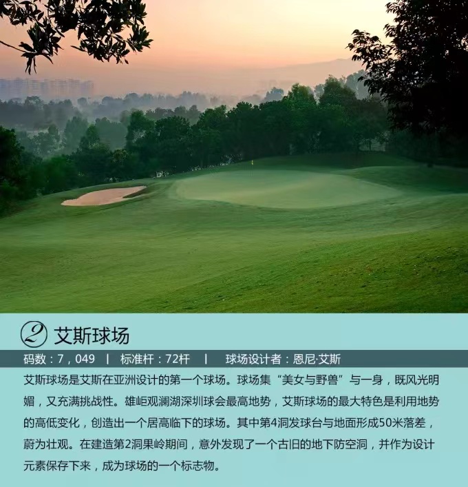 观澜湖深圳会所为观澜湖球场中分别由杰克•尼克劳斯、恩尼•艾斯、尾崎将司、维杰•辛格设计的球场提供服务,以及为会员和来宾提供高尔夫练习球场和推杆果岭。