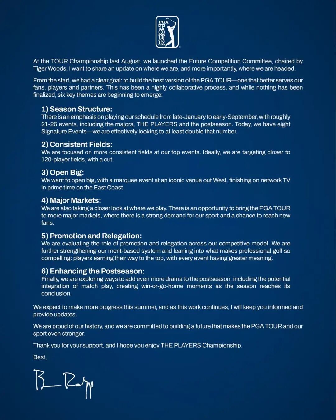 球员锦标赛期间,美巡赛首席执行官布莱恩·罗拉普(Brian Rolapp)召开重磅发布会,宣布未来巡回赛体系的六大改革方向: