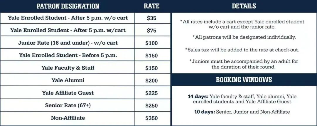 球场价格方面,最低的是耶鲁在读学生,下午5点后无球车仅需35美元,最高则为非关联访客350美元。