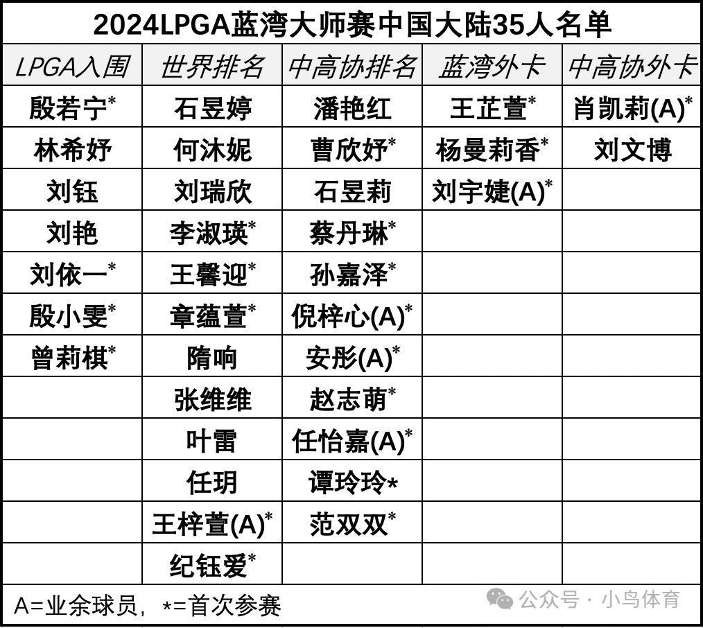 根据中高协公告,石昱婷、何沐妮、刘瑞欣、李淑瑛、王馨迎、章蕴萱、隋响、张维维、叶雷、任玥、王梓萱 (业余)、纪钰爱12人依靠“未通过LPGA参赛资格入选的女子世界排名靠前”的类别入选。