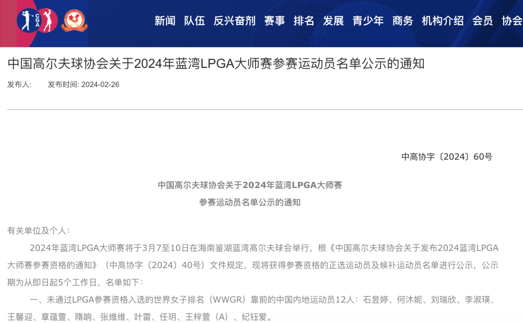 随着中高协今日发布公告,宣布2024年蓝湾LPGA大师赛的中国大陆参赛运动员名单,这场下周四即将开杆的女子美巡海南盛事,东道主军团正式成军!