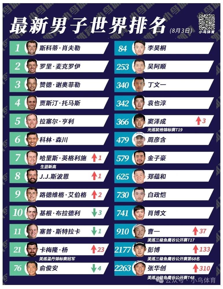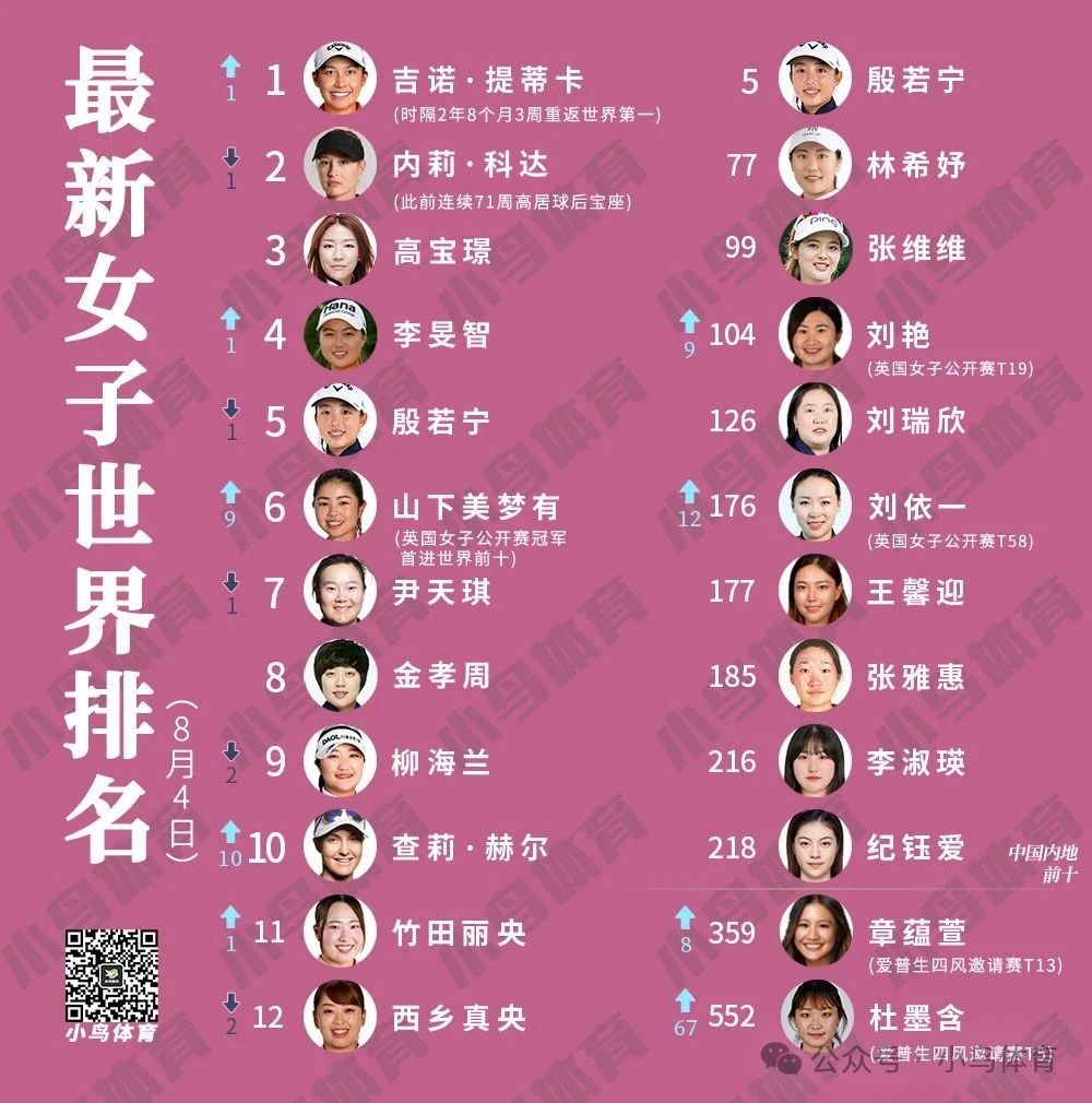 依靠英国女子公开赛神奇斩获大满贯首胜,日本姑娘山下美梦有由世界第15位,跃居第6位,生涯首次进入世界前十。而在她身前,澳洲名将、今年女子PGA锦标赛冠军李旻智超越了殷若宁,升至世界第4。中国一姐则遗憾退居世界第5。这也是自2025年4月21日以来,殷若宁时隔15周,首次无缘世界前四。