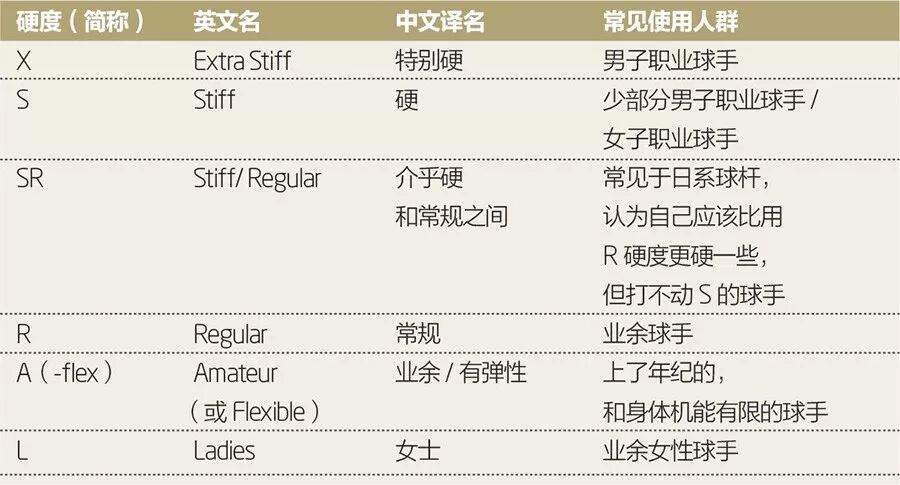 从译名对照表中我们不难发现,我们通常认为R硬度的杆身其实不软,顶多说它是常规硬度,如果说软,应该是A杆身更软。但是,为什么我们在国内销售的球杆只有R、SR或S硬度,几乎看不到A硬度呢?这或许代表了市场营销者的心理——没有消费者愿意在杆身上,承认自己的缺陷。但是有一点几乎可以肯定,各大品牌标配的球杆,正在把杆身越做越软,换句话说,硬度越标越高了。之所以造成这种现象,究其原因是因为越来越多的球手认为如果打S硬度的杆身会比较直比较远。为了促进球杆销售,又可以让球手感觉好用怎么办?球具厂商把杆身标注成SR,杆身甚至与常规的A-flex硬度一样软。于是乎,消费者看到SR,感觉自己依旧年轻,打起来杆身却十分有“弹射感”,球杆大卖,皆大欢喜。