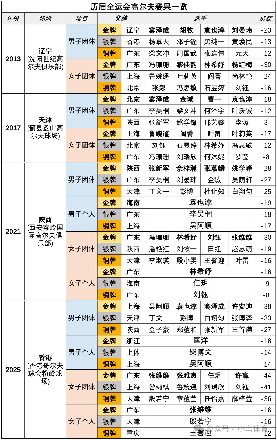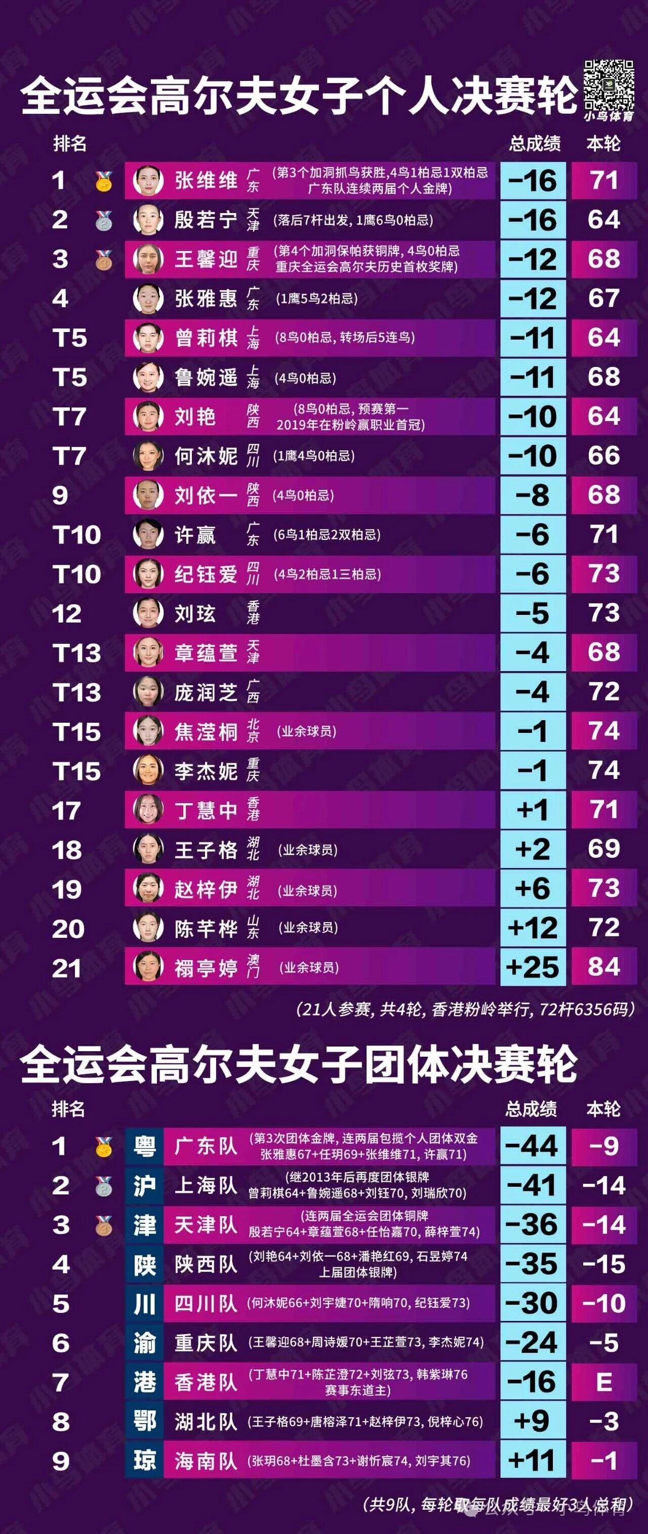 张维维、张雅惠、任玥、许赢组成的广东女队,则以3杆优势力压上海女队,继2013、2021年之后,第3次斩获全运会团体金牌,也是连续第二届包揽女子团体+个人双金,-44总成绩也刷新历届全运会最低杆纪录!