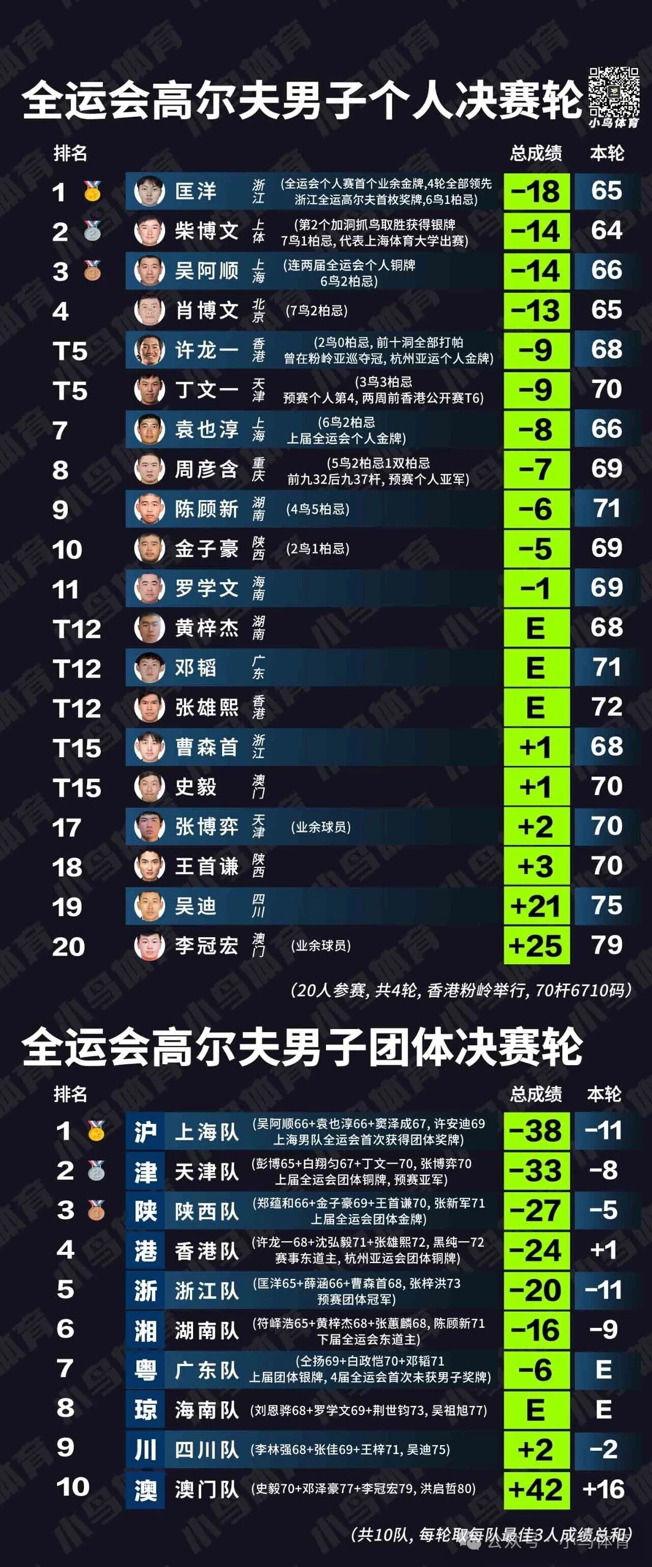 而以上海体育大学学生之姿,独自出战个人赛的19岁小将柴博文,依靠决赛轮7只小鸟的64杆,跃居个人赛并列第二,并在与上海队名将、欧巡五冠王吴阿顺的加洞赛PK中,依靠第2个加洞的小鸟球,勇夺银牌!