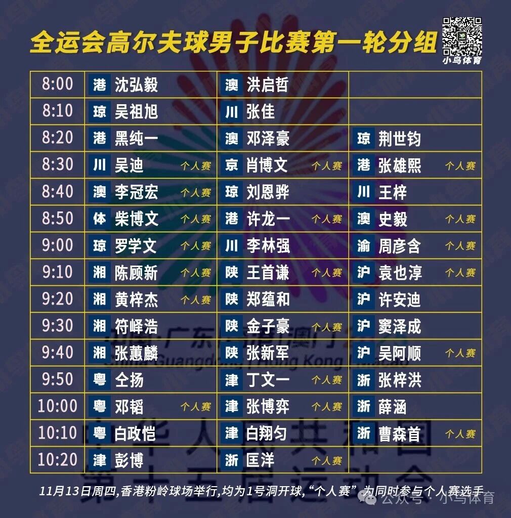 四年一届的全运会高尔夫球项目比赛将于11月13日-16日在香港哥尔夫球会粉岭球场举行。赛事首轮分组及开球时间已于周二下午公布,来自全国16个代表队的42名男选手和40名女选手将对4个项目的12块奖牌展开竞逐。