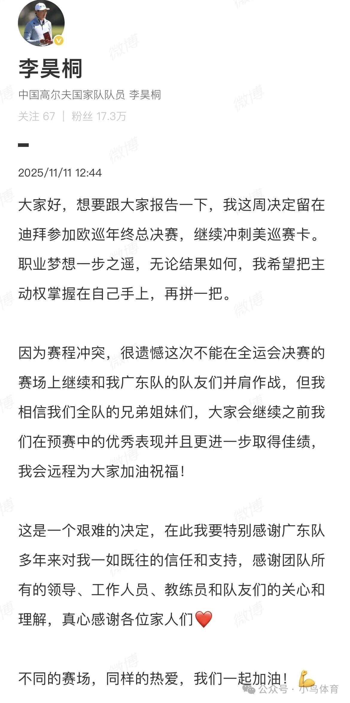 不过全运会球星阵容还是存在一些“遗珠”,中国头号男球手李昊桐便同样在周二宣布,留在迪拜出战欧巡总决赛DP世界巡回锦标赛,为美巡资格最后一搏,不得不放弃全运会。此外,福建队职业新人陈沛成留守美国赛场,也未在个人赛名单中出现。