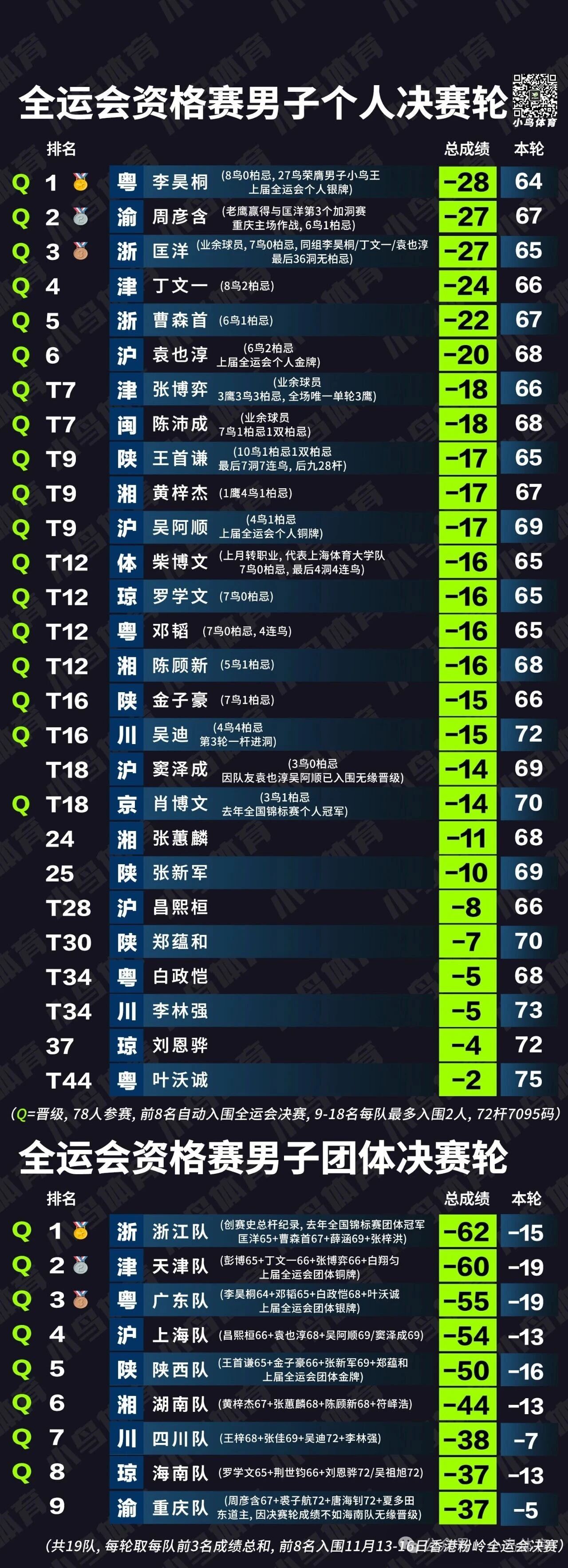 个人项目则由20名男球手和21名女球手参与争夺。由于一个省市队最多只能是预赛排名前2位的球员(上图右滑),有资格参加个人赛,这也是为什么,窦泽成、张新军、白政恺、刘瑞欣、石昱婷、周诗媛等实力名将尽管入选团体赛名单,却无缘本届全运会个人奖牌的争夺。