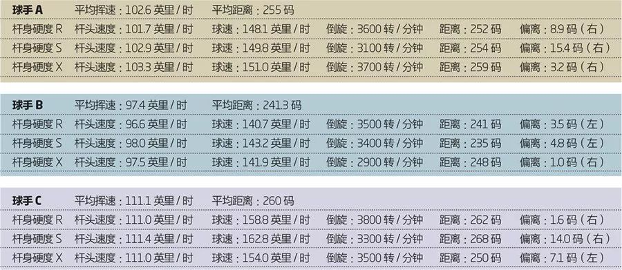 由美国量身定做实验,我们不难发现:对于挥杆速度最快的球手C,如果他使用了X硬度的杆身,那么他的挥杆效率平均值是,球速降低了8.8英里/时,由此带来18码的开球距离损失;对于挥杆速度最慢的球手B,从R杆身过渡到X杆身,他得到了更快的挥杆速度,更快的球速,较少的倒旋,更远的距离和更紧凑的落点区间!