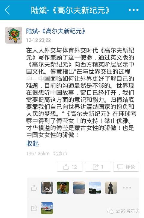 陆斌在书的下篇最后一个章节“故事历程“中写了这样一段话:在写作的过程中发现,既然自己无力改变一些背景大局打造一座顶级的高尔夫场地,莫不如为众多高尔夫爱好者们奉献一座顶级的心灵高尔夫场地。如此出发点,”高尔夫文化使者“的称号,他当之无愧!