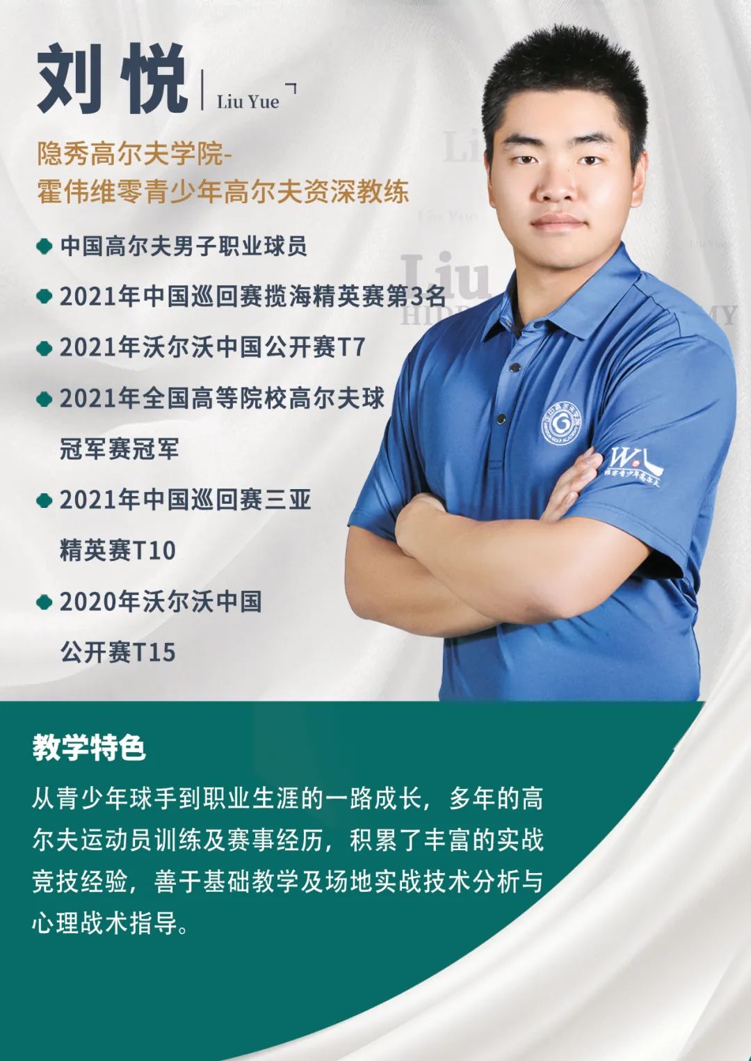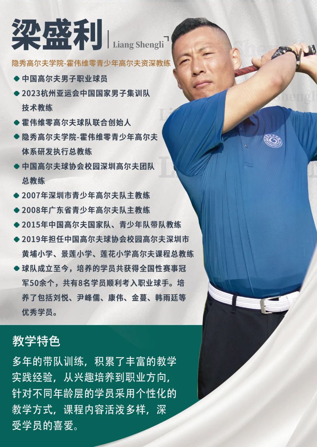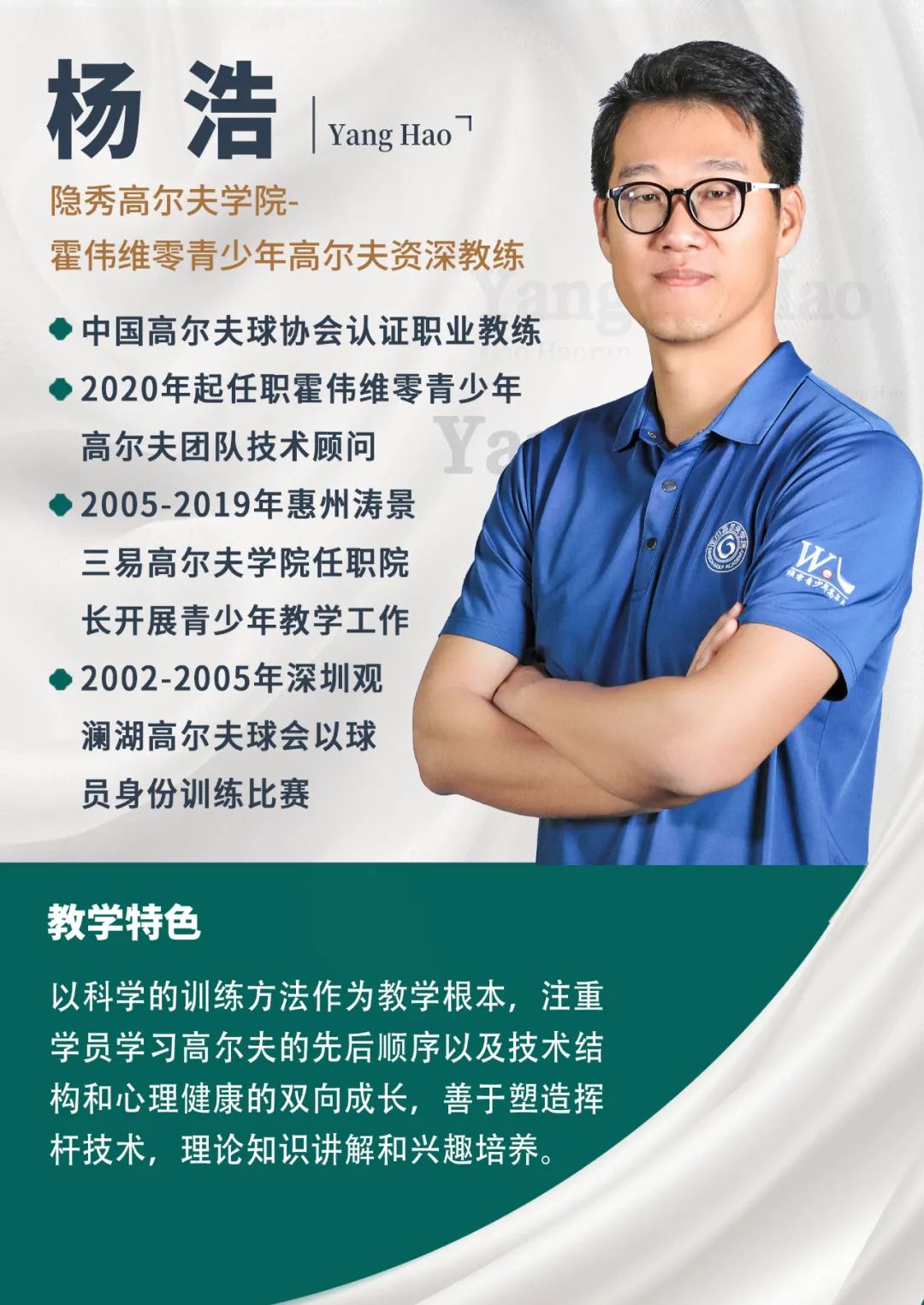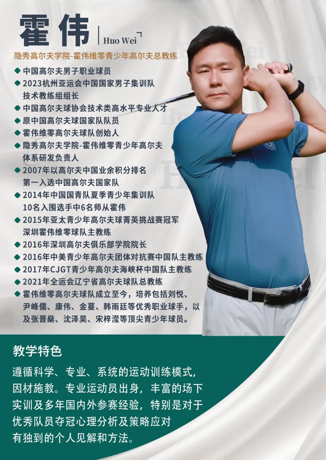 霍伟教练本着“让中国高尔夫青少年通过科学合理的训练,保护好身体的前提下,健康快乐地享受高尔夫”的初心,与有着共同目标的师兄梁盛利教练一起搭档组队,将多年运动及参赛经历提炼总结,于2012年正式成立“维零高尔夫球队”,这也是国内第一支专注青少年高尔夫训练的球队。