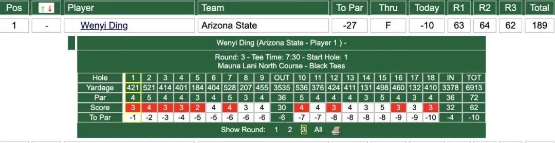 据美国头号业余高尔夫资讯网站amateurgolf.com统计——丁文一的189杆,创下了美国大学联赛有史以来的54洞最低杆纪录!不仅如此,19岁的中国小将,还成为了NCAA历史上第一位在三轮赛制中突破190杆的球手!