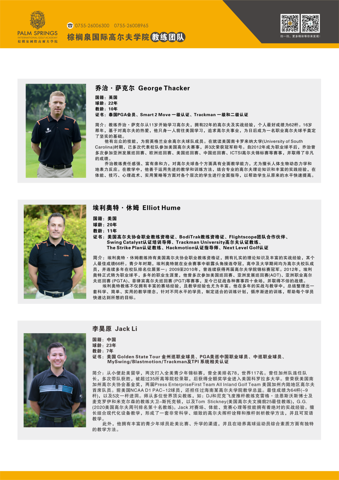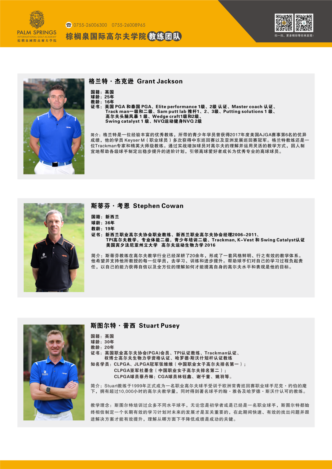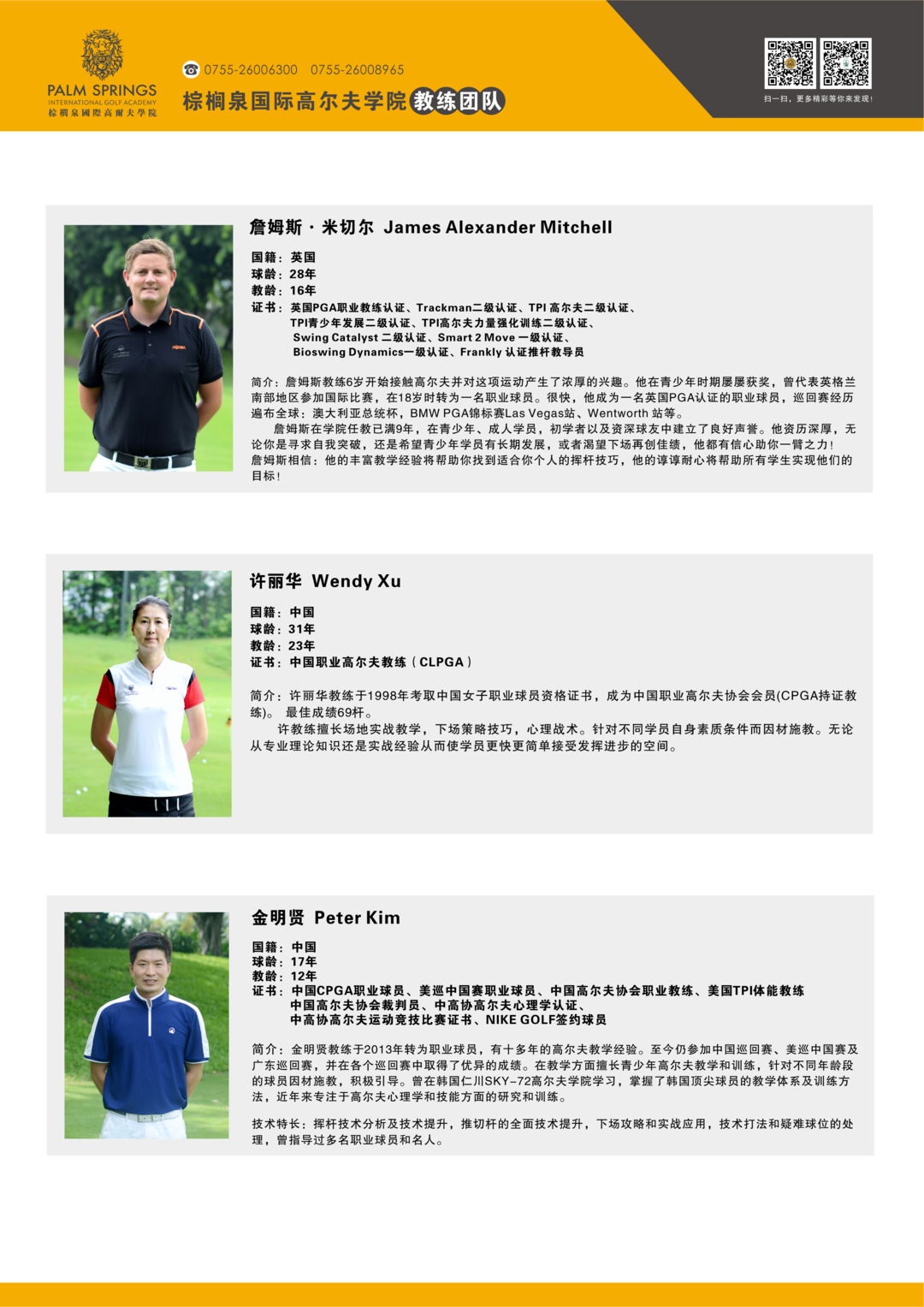 棕榈泉国际高尔夫学院教学团队简介