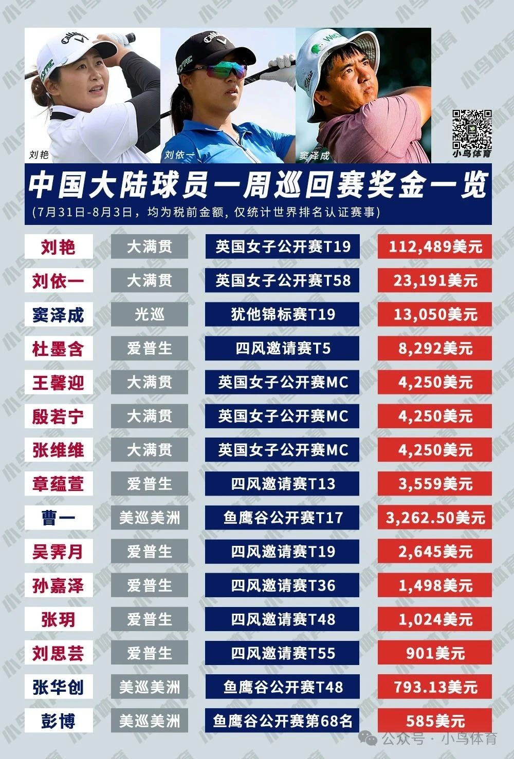 首次参加英国女子公开赛的刘依一,是两朵晋级决赛的中国金花之一,并列第58名收获23,191美元 (16.6万元) 奖金。最近5次参赛,刘依一连续3场大满贯成功晋级,还在苏格兰女子公开赛收获第15名——仅这4役就狂揽167,969美元 (120万元),占到了她2025赛季总奖金 (203,831美元) 的82.4%!CME积分榜,24岁西安姑娘位列第85位,有望冲击前80名的明年全卡大种子资格。