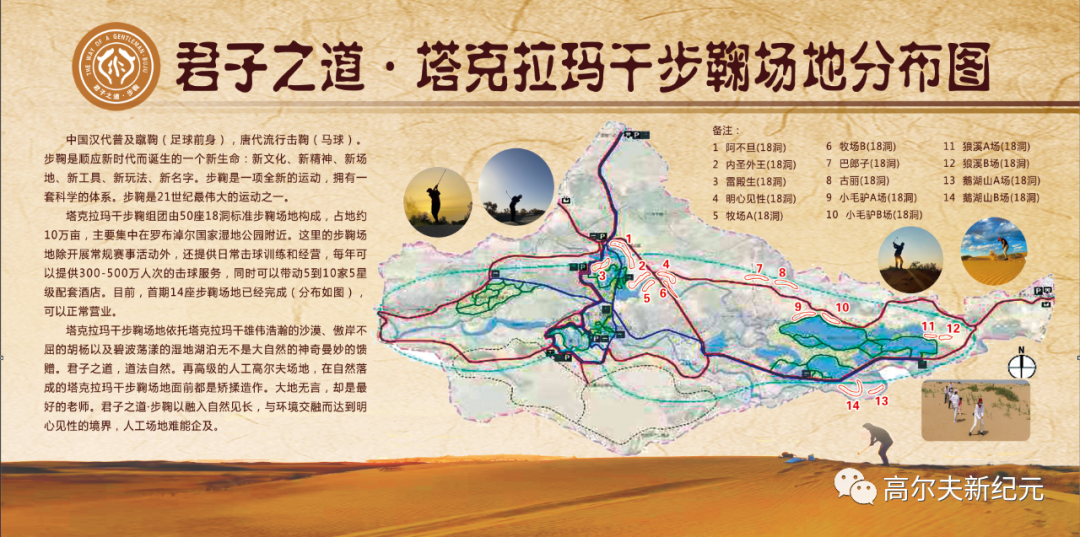 塔克拉玛干步鞠组团最少由100座以上的18洞标准步鞠场地构成,占地约20万亩左右,其中大约50座步鞠场地主要集中在罗布人村寨内。这里的步鞠场地除开展常规赛事活外,还提供日常击球训练和经营,每年可以提供300-500万人次的击球服务,同时可以带动5到10家5星级配套酒店。