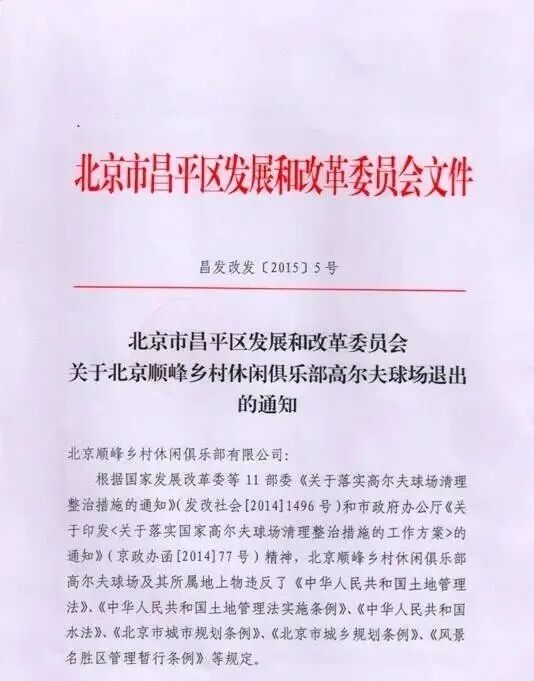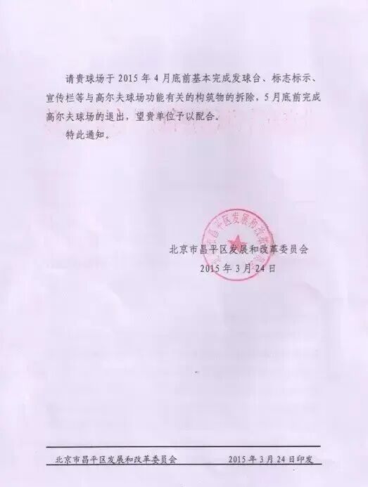 2015年3月27日上午,北京顺峰乡村俱乐部收到了一份来自昌平区发改委的文件,要求他们在两个月内拆除所有高尔夫设施。