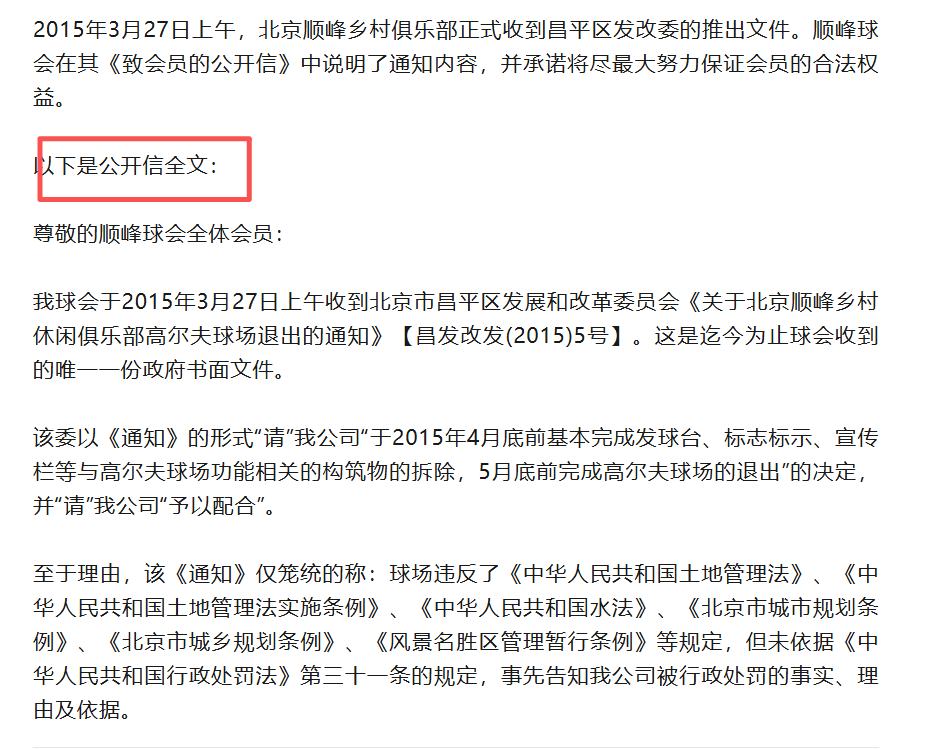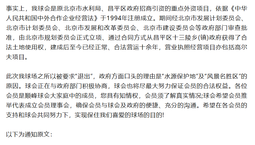 球场马上向会员发出公开信,表达了自己的“冤枉”:他们明明是通过正规程序从镇政府获得的土地使用权,营业执照上也明确包含高尔夫项目。