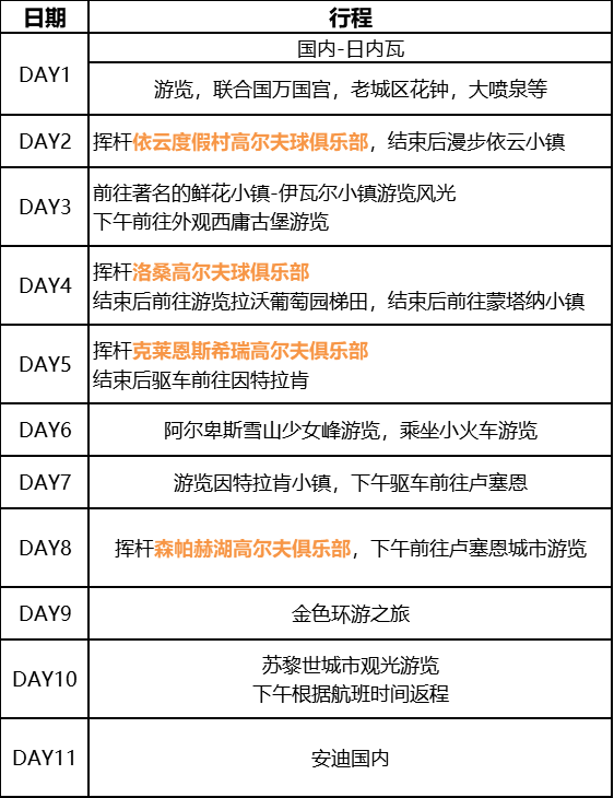 1. 全程安排瑞士+法国依云小镇共4场经典顶级球场的18洞高尔夫球;