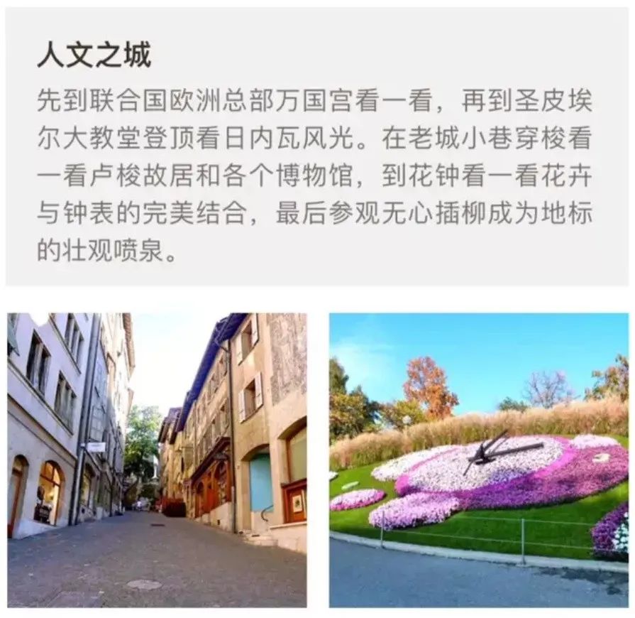 贵宾搭乘航班飞往瑞士日内瓦,到达后游览,联合国万国宫,老城区花钟,大喷泉等,结束后前往酒店入住休息