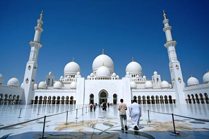 穿梭于各色服饰的人群当中,踏足传统和现代的繁华胜地,伴随着经文诵念和阿拉伯传统民族音乐,赏阿布扎比大清真寺宛如天空之境,沉浸于时光穿梭的美妙体验。